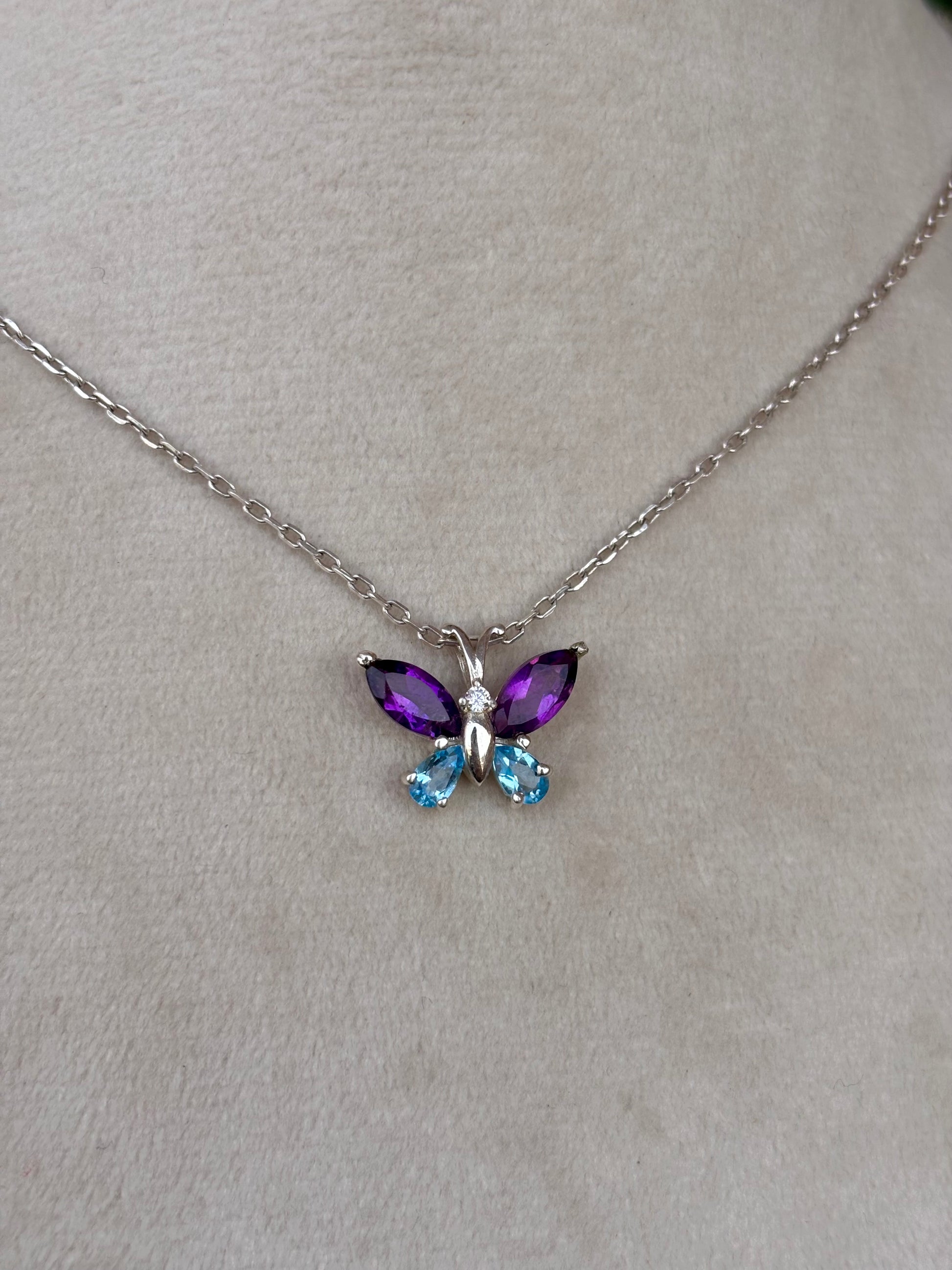 Blue Topaz And Amethyst Butterfly Necklace in 92.5 Sterling Silver