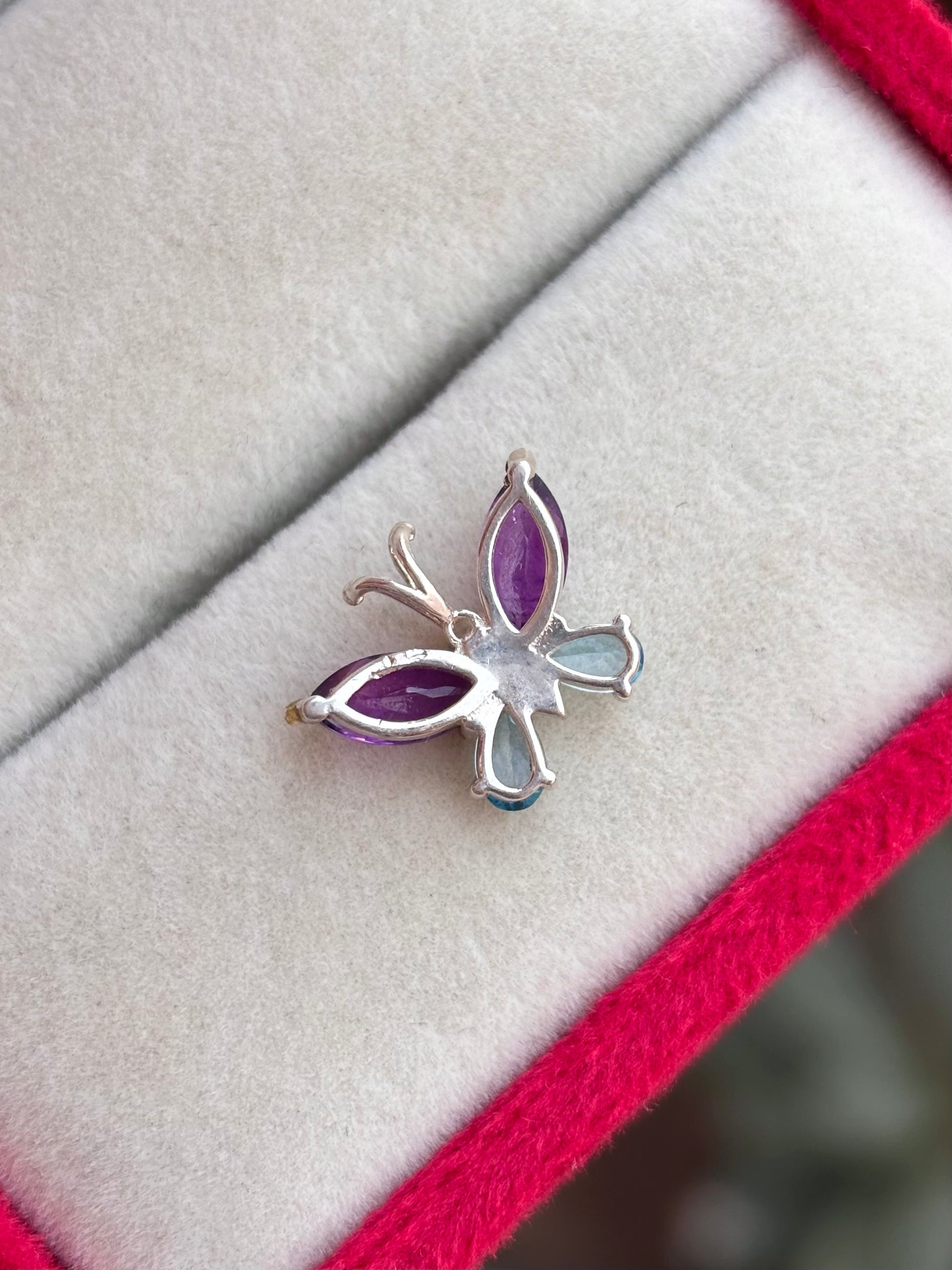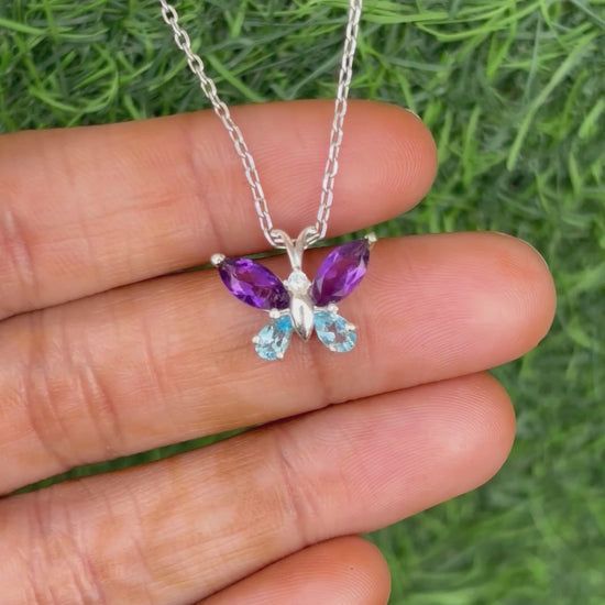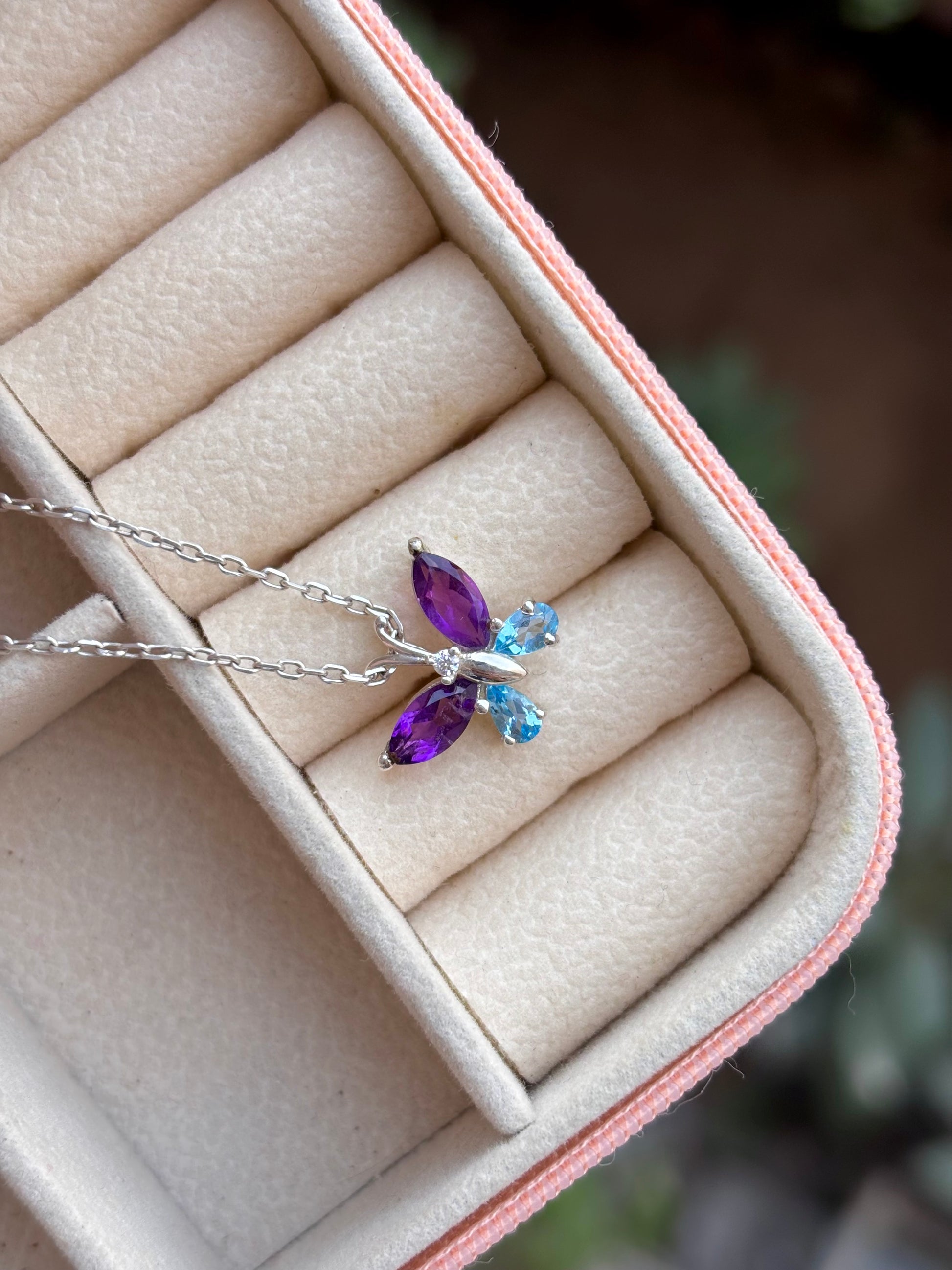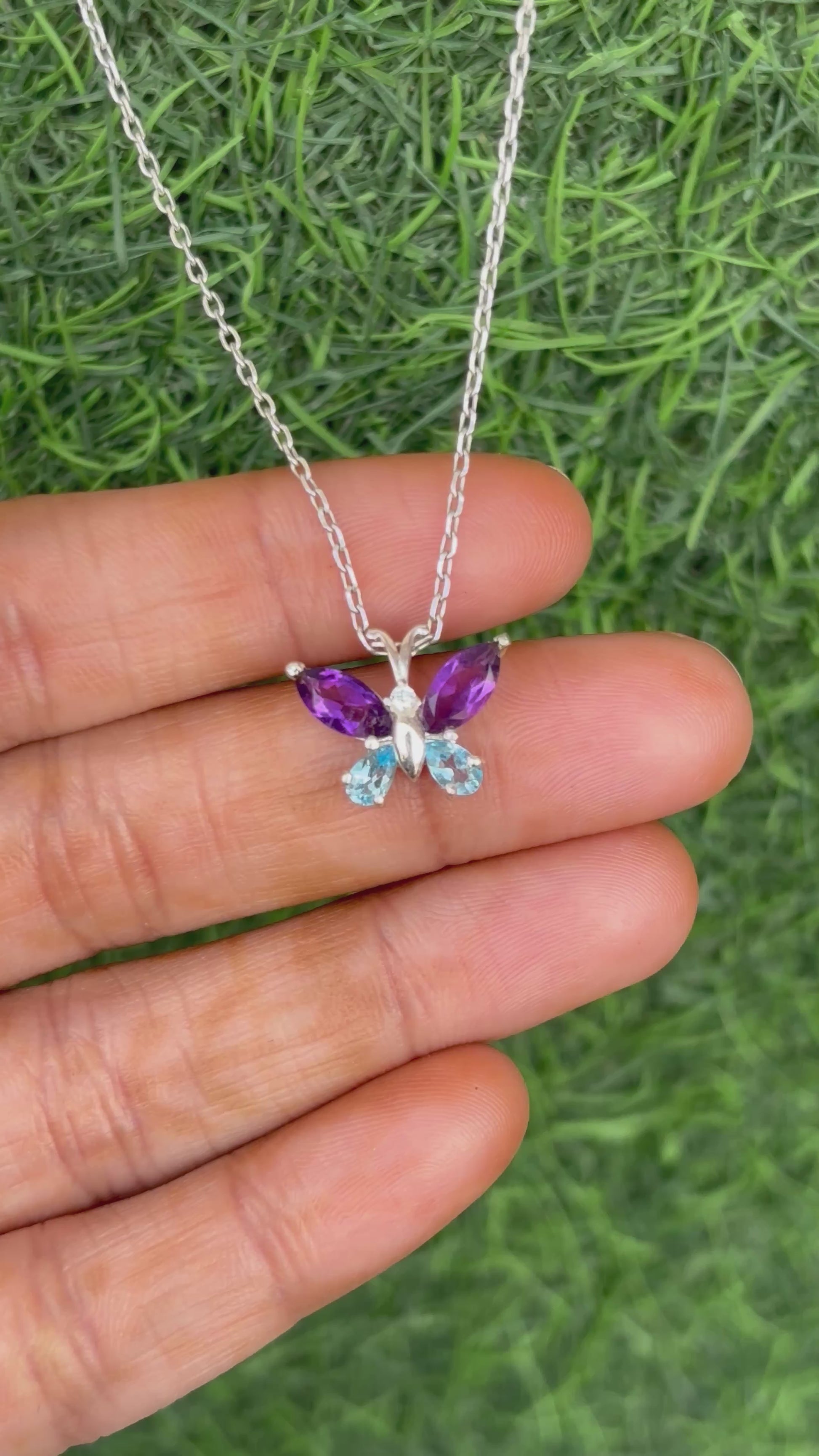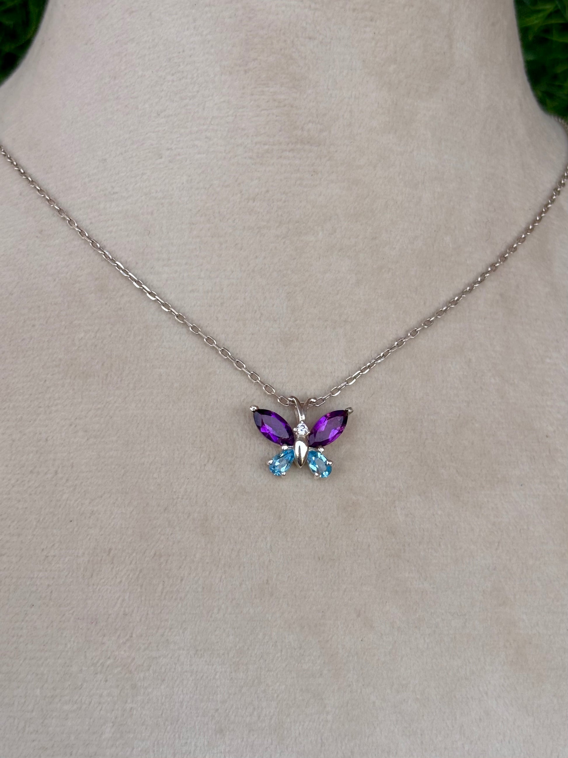 This elegant butterfly pendant necklace is crafted from genuine 92.5 sterling silver and adorned with sparkling blue topaz and rich purple amethyst gemstones, creating a graceful and eye-catching design 🦋💎. Perfect for everyday wear or as a meaningful gift, this gemstone butterfly necklace symbolizes transformation, beauty, and freedom.